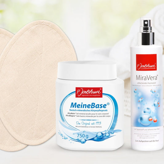 Die AlkaWear von P. Jentschura Funktionswäsche umfaßt Basenwickel, wie den basischen Leibwickel, den Stirnwickel und die beliebten basischen Strümpfe, sowie basische Stulpen. Für eine basische Anwendung als basische Wickel wird eine basische Lauge benötigt - hierzu empfiehlt sich das Jentschura Meine Base Badesalz, das basische Badepulver von Bioleo oder das Basenbad von pH-Cosmetics. Der Basenwickel wird in der basischen Lauge getränkt, gut ausgedrückt angelegt und dann abgedeckt.